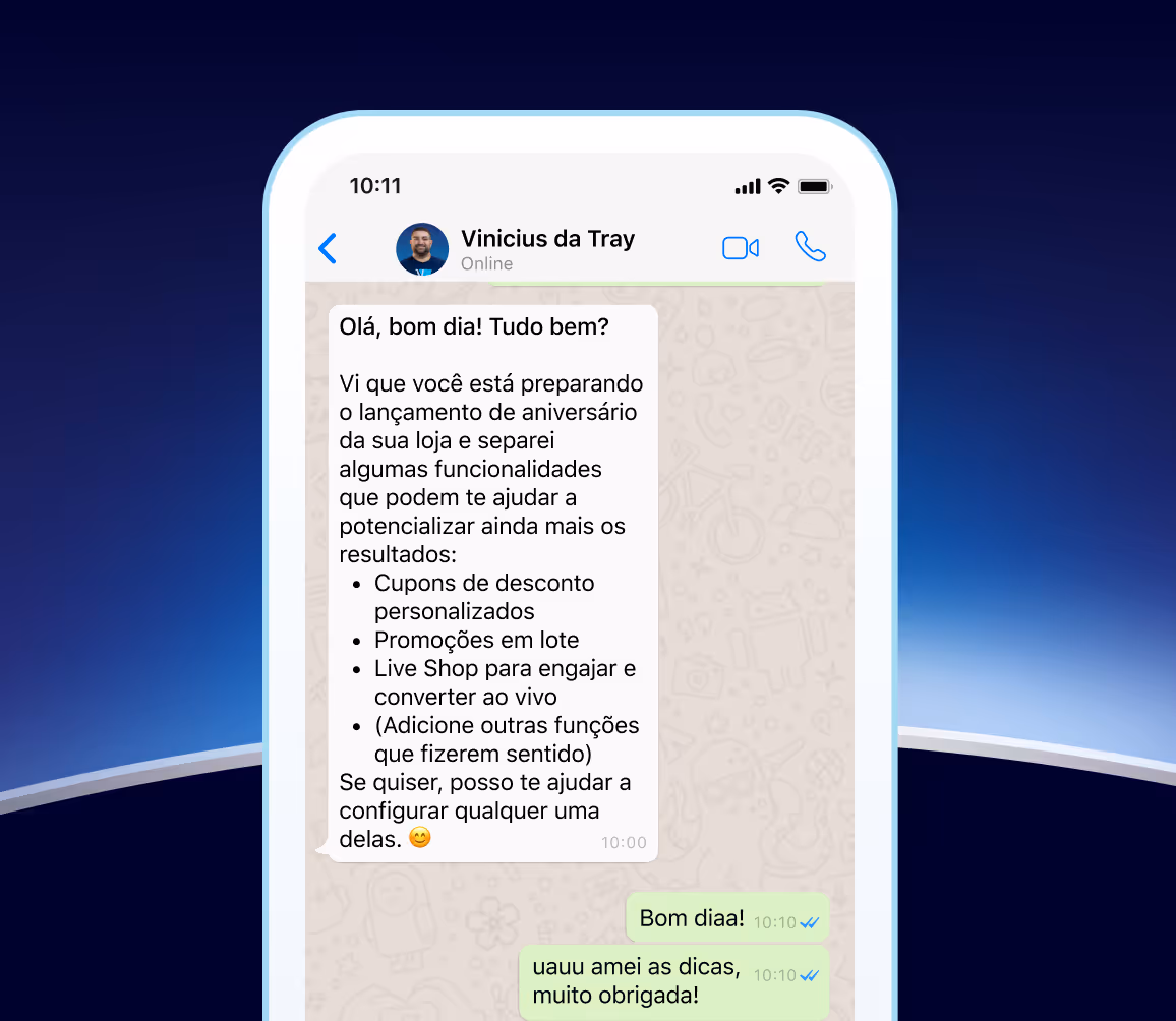 A Tray acompanha a jornada do lojista, oferecendo suporte próximo e uma plataforma preparada para responder às demandas de um negócio em constante expansão.